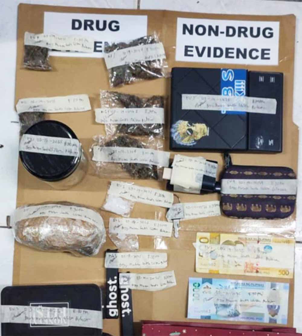 During the operation, authorities seized 1,500 grams of suspected marijuana valued at P300,000.00, along with five grams of suspected shabu worth P34,000.00. Also confiscated were a pack of rolled dried marijuana, a transparent plastic container with suspected dried marijuana, a glass container with suspected kush, five heat-sealed plastic sachets of suspected marijuana, one brick of suspected dried marijuana, and various drug paraphernalia.