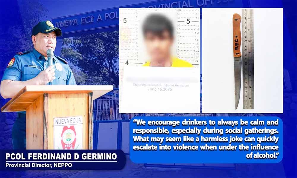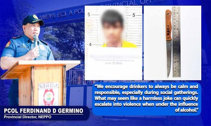According to a report submitted to P/Col. Ferdinand D. Germino, Provincial Director, NEPPO, the incident occurred around 5 a.m. and involved a 30-year-old farmer who sustained a serious head injury after being stabbed by a 37-year-old male, both residents of the area.