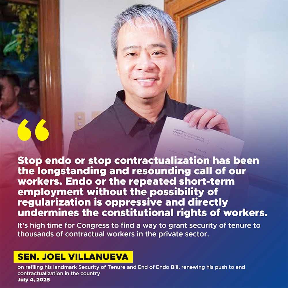 “Stop endo or stop contractualization has been the longstanding and resounding call of our workers. Endo or the repeated short-term employment without the possibility of regularization is oppressive and directly undermines the constitutional rights of workers,” said Villanueva, who headed the Senate committee in labor, employment and human resources development in the last Congress.