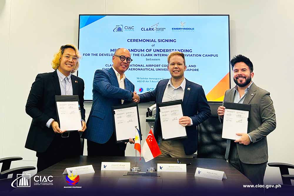 CLARK FREEPORT ZONE, Pampanga — The Clark International Airport Corporation (CIAC) has signed memoranda of understanding (MOUs) with three Singapore-based aviation firms Dviation Training Centre Sdn. Bhd., Embry-Riddle Aeronautical University–Asia Ltd., and ST Engineering Urban Solutions Ltd., marking a major step toward the development of the Clark International Aviation Campus.