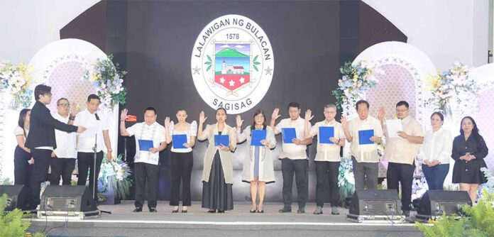 Witnessing the oath taking are (from left) Vice Gov. Alexis C. Castro, Mayors Maria Rosario Sy-Alvarado-Mendoza, Atty. Christian D. Natividad of the City of Malolos, and Ian Marc Marcos of Paombong, Department of the Interior and Local Government-Bulacan Provincial Director Myrvi Apostol-Fabia, and Provincial Administrator Antonia V. Constantino. (Photo courtesy of Provincial Public Affairs Office)