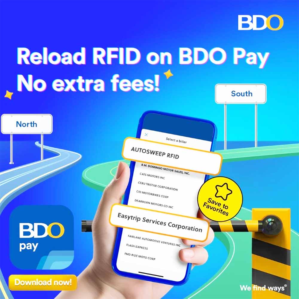 To reload, simply open the BDO Pay app, select Pay Bills > Transportation > Autosweep RFID or Easytrip RFID, enter your details, and tap Pay. Users can also save their transaction as a Favorite for faster reloading next time.