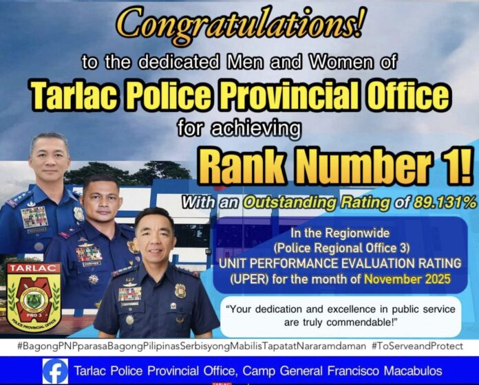 CAMP GEN. Francisco Macabulos, Tarlac City — Muling nagpakitang-gilas ang Tarlac Police Provincial Office (TPPO) matapos makamit ang Outstanding Rating na 89.131% sa Regionwide Unit Performance Evaluation Rating (UPER) ng Police Regional Office 3 para sa buwan ng Nobyembre 2025.