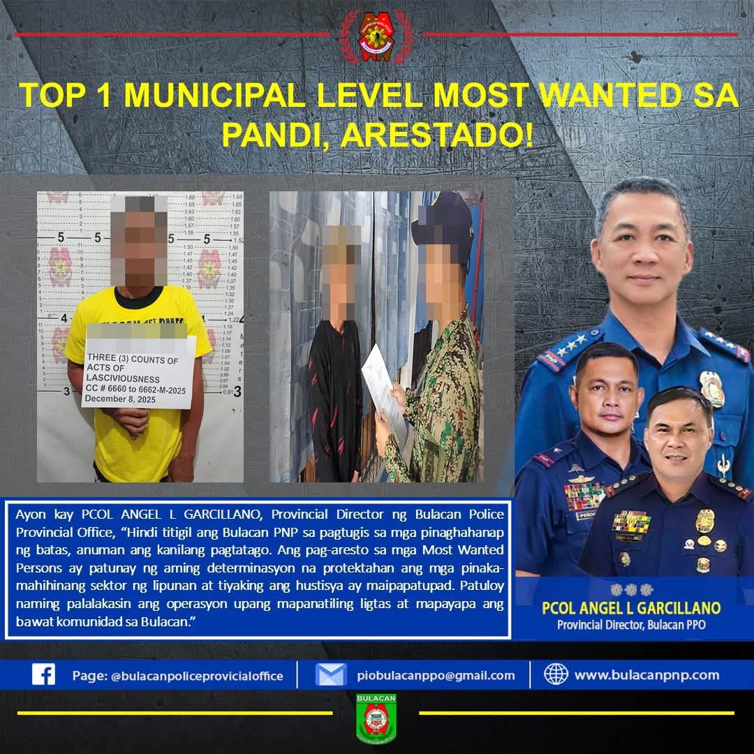 CAMP ALEJO SANTOS, Bulacan — Sa patuloy na pagtugon sa direktiba ng Acting Chief PNP, Lt. Gen. Jose Melencio C. Nartatez, Jr., matagumpay na naaresto ng Tracker Team ng 1st Provincial Mobile Force Company (1st PMFC), katuwang ang Pandi Municipal Police Station at 301st Maneuver Company, RMFB 3, ang Top 1 Most Wanted Person (Municipal Level) ng Pandi sa ikinasang operasyon sa Brgy. Cacarong Matanda, Pandi, nung Lunes ng hapon ( Dec. 8).