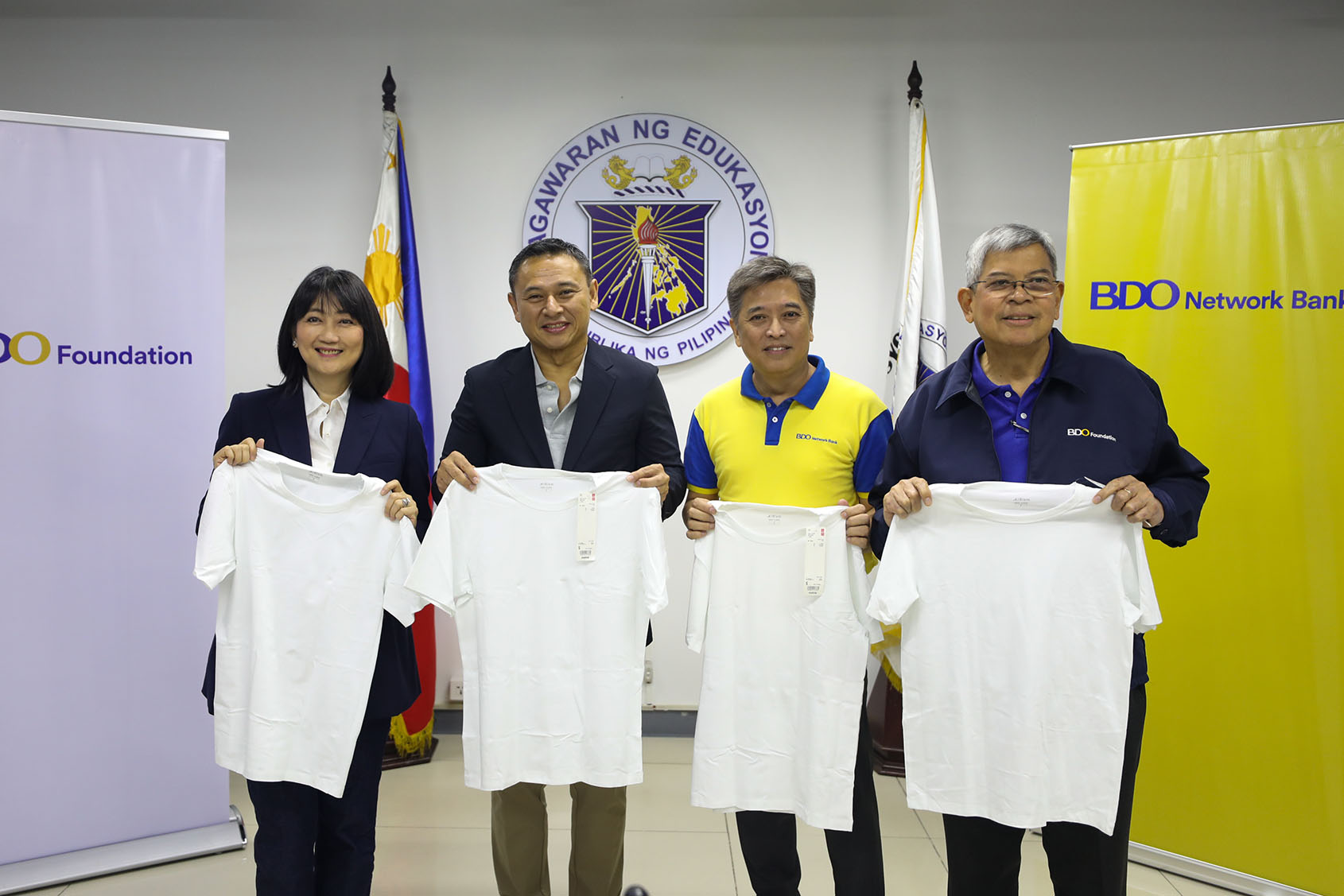 UNIQLO, BDO Network Bank, BDO Foundation, and the Department of Education join forces to provide LifeWear for public school teachers nationwide Uplifting Teachers, Strengthening Communities through the Power of Clothing. (from left) UNIQLO Philippines Chief Operating Officer Geraldine Sia, Department of Education Secretary Sonny Angara, BDO Network Bank Group Head Alberto O. Quiogue, and BDO Foundation President Mario A. Deriquito during the ceremonial turnover of UNIQLO AIRism shirts for distribution of DepEd to public school teachers nationwide.