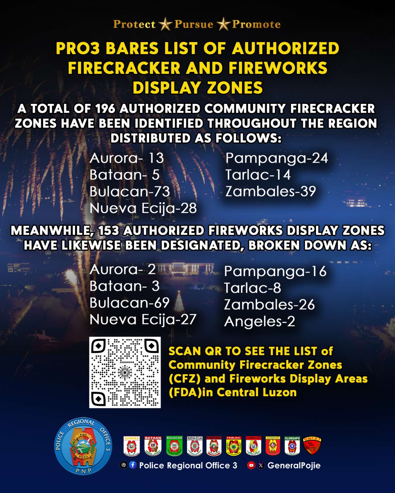 Meanwhile, 153 authorized fireworks display zones have likewise been designated, broken down as: Aurora – 2; Bataan – 3; Bulacan – 69; Nueva Ecija – 27; Pampanga – 16; Tarlac – 8; Zambales – 26; and Angeles City – 2.