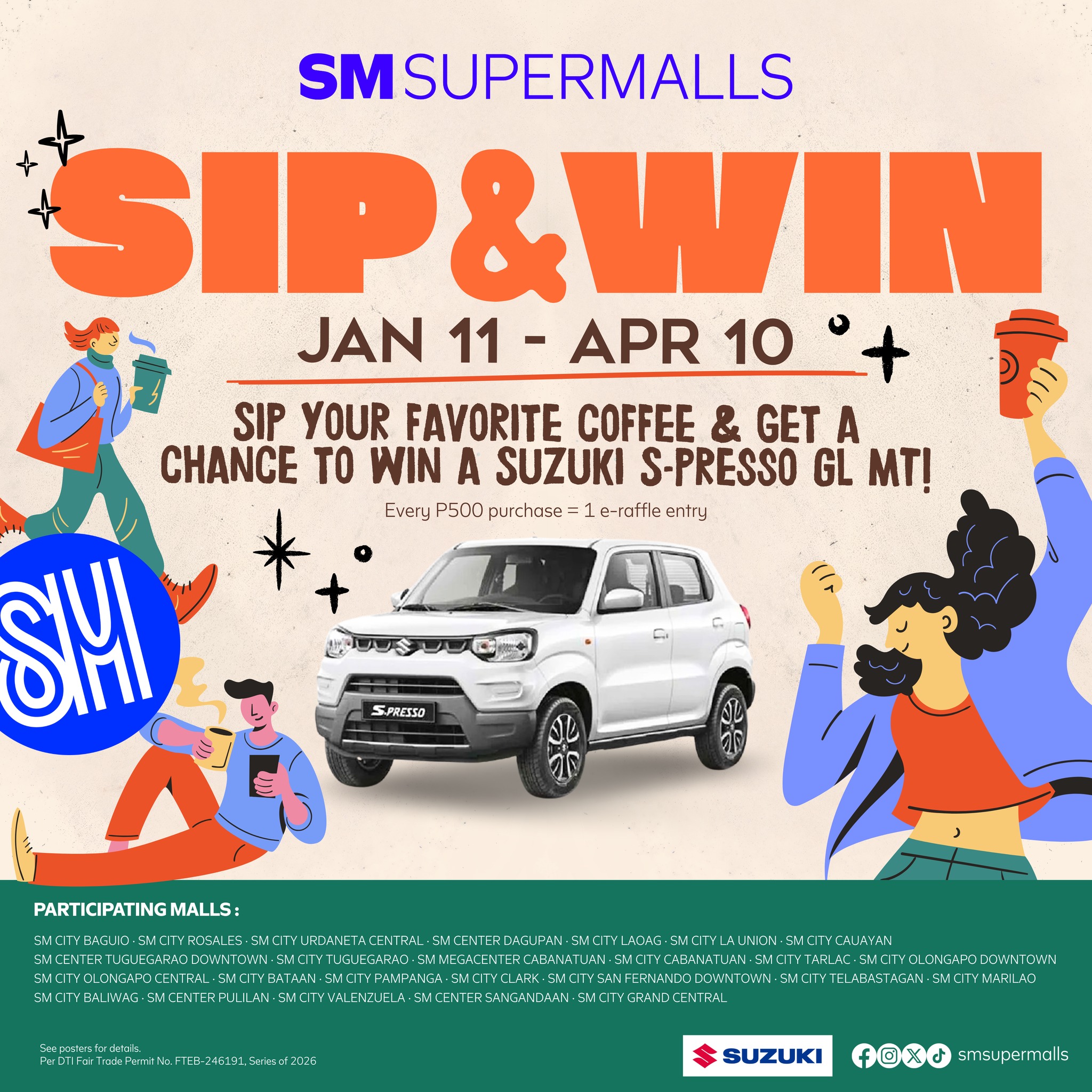 From handcrafted brews to comforting everyday favorites, every coffee break now comes with the chance to win. Shoppers earn one (1) e-raffle entry for every ₱500 worth of single or accumulated purchases from participating tenants. Each sip brings you closer to winning a Suzuki S-Presso GL MT, turning ordinary coffee runs into something truly memorable.
