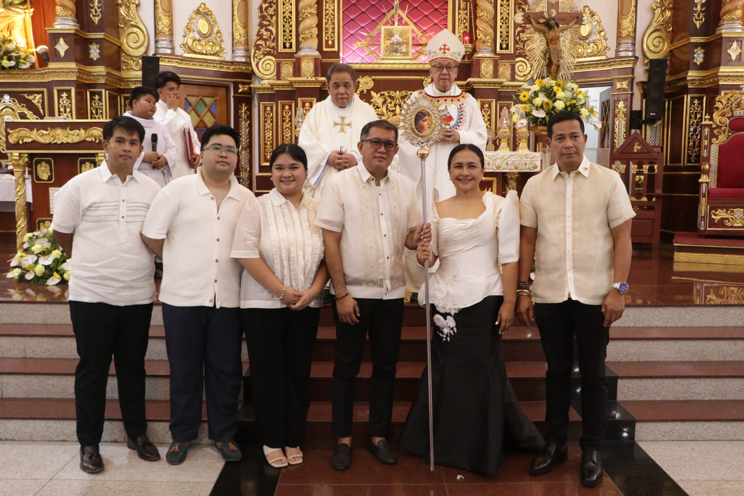 STO. NIÑO FIESTA IN CALUMPIT. Governor Daniel R. Fernando passes the role of Hermano Mayor to Councilor Maureen I. Torres and her family during the Pistang Parokya 2026 of the Sto. Niño Parish in Calumpit, Bulacan yesterday. Witnessing the transfer are (back row) Parish Priest Rev. Fr. Vicente Robles and Archdiocese of Caceres Archbishop Emeritus Rolando Tria Tirona.(Photo courtesy of PPAO)