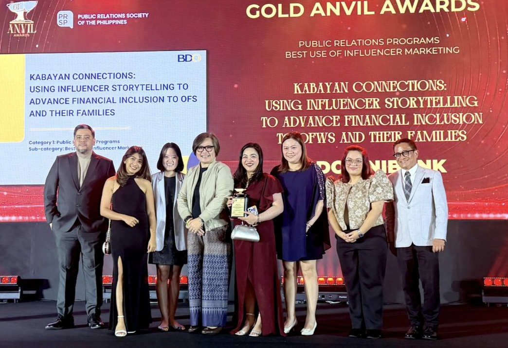 BDO Unibank earned a Gold Anvil Award for its “Kabayan Connections” campaign at the 61st Anvil Awards, under the Public Relations Programs – Best Use of Influencer Marketing category.