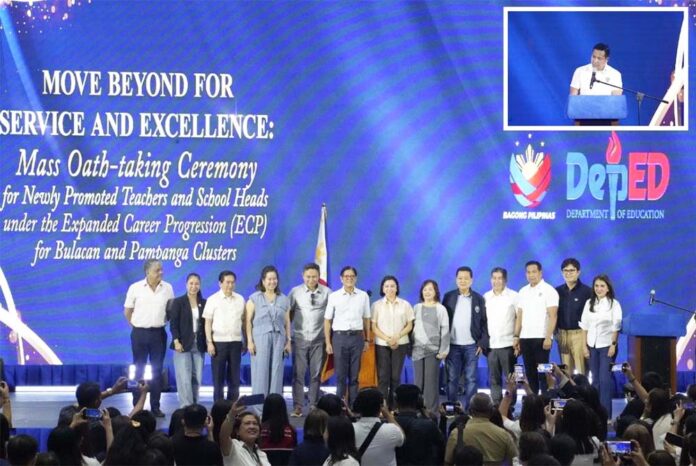 PRESIDENT Ferdinand “Bongbong” R. Marcos, Jr., along with Education Secretary Juan Edgardo “Sonny” Angara and (first from left) Special Assistant to the President Antonio Lagdameo, Jr., poses for a photo opportunity with the government officials from the provinces of Pampanga and Bulacan, including (2nd from left) San Fernando City Mayor Vilma Caluag, Representatives Henry Villarica and Anna York Bondoc, Baliwag City Mayor Sonia Estrella, Representatives Gloria Macapagal-Arroyo, Salvador Pleyto, and Arthur Robes, Gov. Daniel R. Fernando, Vice Gov. Alexis C. Castro, and City of San Jose Del Monte Mayor Florida Robes during the Mass Oath-Taking Ceremony for Newly Promoted Teachers and School Heads under the Expanded Career Progression for Bulacan and Pampanga on Thursday, February 19, at the CSJDM Sports Complex, City of San Jose Del Monte, Bulacan. INSET: Fernando delivers his message for the newly promoted teachers, reiterating that they are the very heart of education in the country. (Photo courtesy of PPAO)