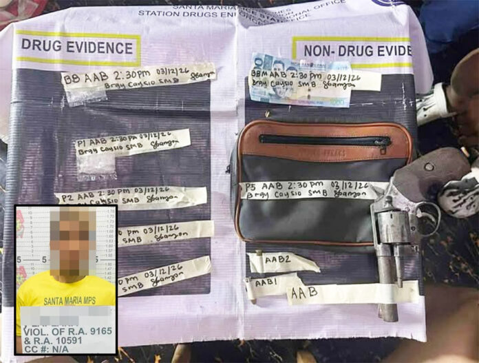 CAMP ALEJO SANTOS, Bulacan — Arestado ang isang hinihinalang tulak ng ilegal na droga matapos ang isinagawang buy-bust operation ng mga operatiba ng Santa Maria Municipal Police Station (MPS) na nagresulta rin sa pagkakasamsam ng hinihinalang shabu at baril sa Brgy. Caysio, Santa Maria, Bulacan noong Huwebes ng hapon (Marso 12, 2026).