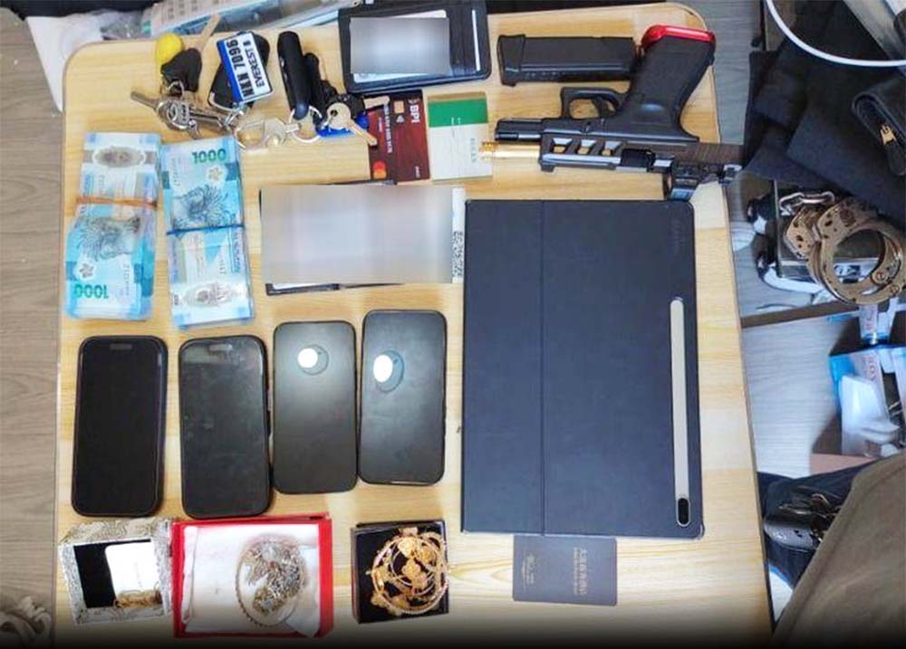 Confiscated from the suspect’s possession were 14 assorted gold and silver jewelry items belonging to the victim, one Glock 17 9mm pistol with 14 live ammunition and one magazine, 4 iPhone cellular phones, one Samsung S7 tablet, 4 fake identification cards, and cash amounting to P187,000.