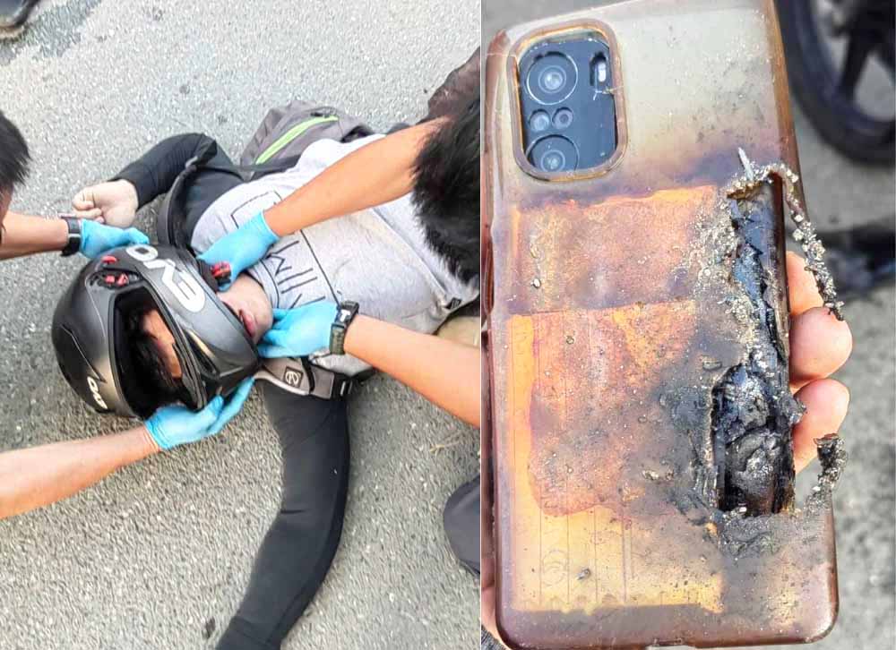 Sa larawang ibinahagi ni Sharwen Ching Tai, makikita ang rider na nakahandusay sa kalsada at may paso sa tiyan, habang nasa gilid niya ang sunog na cellphone.