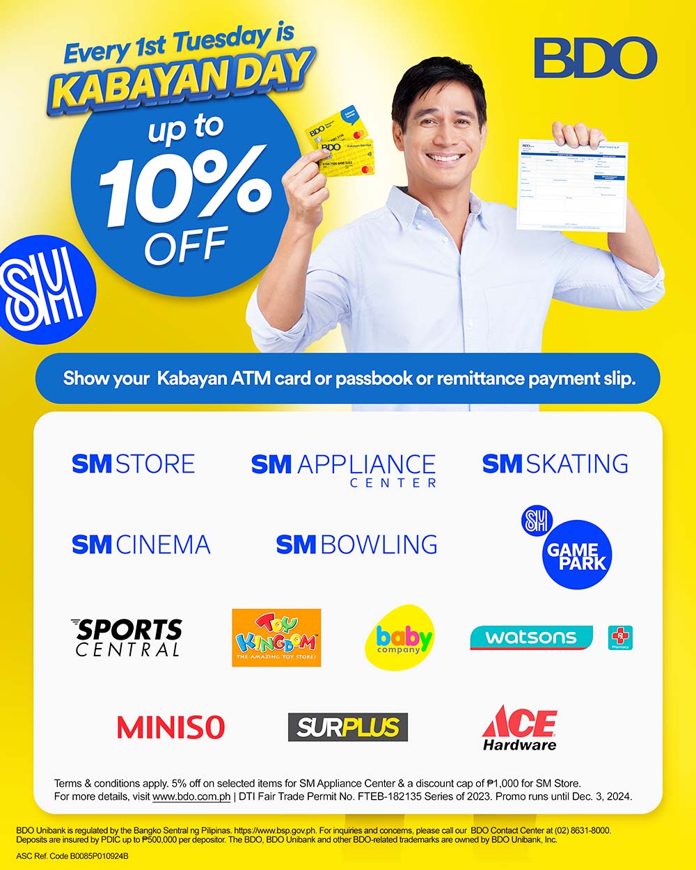 Ready to celebrate Kabayan Day? Visit your nearest SM branch on the first Tuesday of the month and don’t forget to bring your BDO Kabayan Savings ATM card, Passbook, or a validated remittance payment slip to avail the discounts.