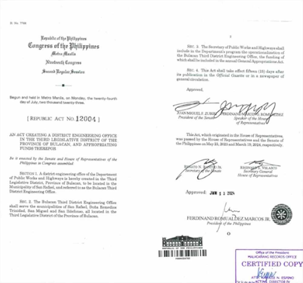 Republic Act Nos. 12003 and 12004 were also signed last June 13, creating the Bataan Third District Engineering Office and the Bulacan Third District Engineering Office, respectively.