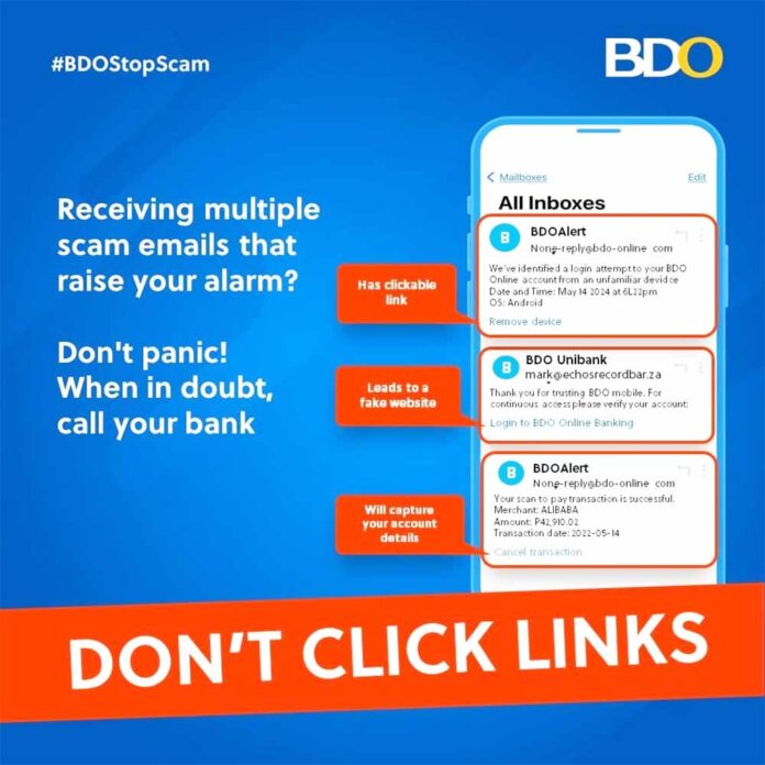 MANILA — In today’s fast-paced world, acting out of panic can lead to dire consequences, including falling victim to scams. BDO Unibank urges its clients and the general public to be cautious of text or email messages that spread fake information, incite panic, and prompt hasty actions, such as clicking on included links.