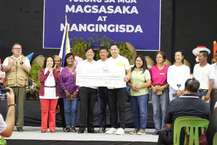 PRESIDENT Ferdinand “Bongbong” Marcos, Jr. and Governor Daniel R. Fernando hold the ceremonial cheque worth P19,660,000.00 for the Province of Bulacan as part of the Presidential Assistance to Farmers, Fisherfolk and Families (PAFFF) during the distribution of PAFFF in Region III held at Bren Z. Guiao Convention Center in the City of San Fernando, Pampanga on Friday (July 12, 2024). Also in the photo are (from left) Department of Agriculture Secretary Francisco Tiu Laurel, Jr., former President and Pampanga 2nd District Representative Gloria Macapagal-Arroyo, and (seated at the right side, turned away) Pampanga Governor Dennis Pineda. (Photo courtesy of Provincial Public Affairs Office)